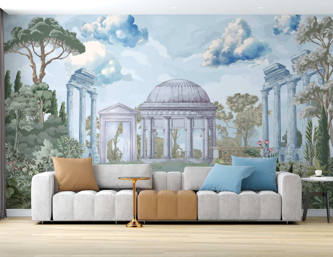 This wallpaper creates a serene, timeless atmosphere with its soft watercolor-style depiction of ancient architectural ruins surrounded by lush greenery and drifting clouds. The domed pavilion, tall columns, and gentle landscape evoke a dreamy European garden scene, adding depth and sophistication to any living space. Its calming blues and greens keep the design elegant and airy, making it a perfect choice for interiors that need a refined yet tranquil focal point.