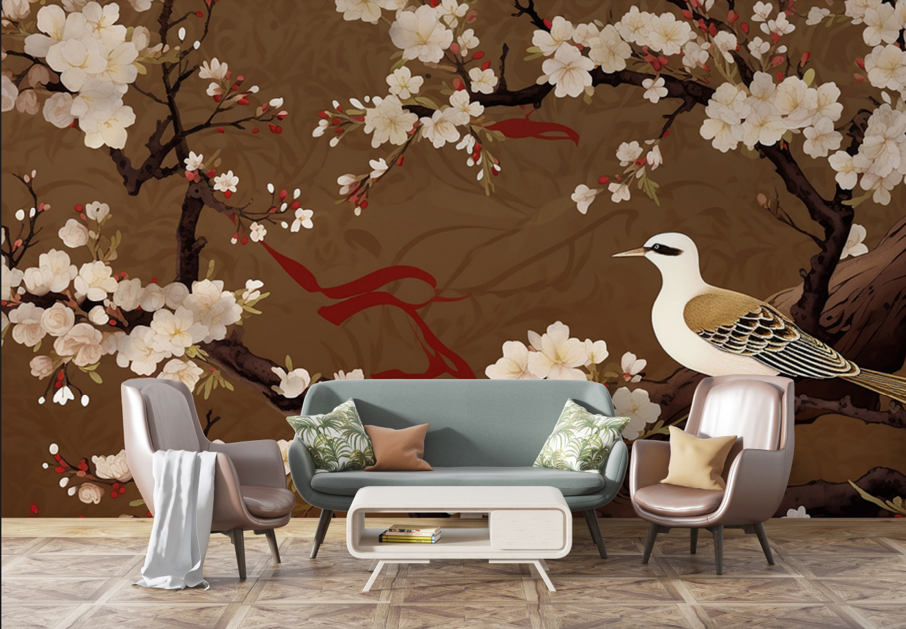 This design delivers a bold, luxurious statement with its deep golden-brown backdrop, detailed cherry blossoms, and a beautifully illustrated bird perched among the branches. The contrast between the rich background and the soft white blooms creates a dramatic yet refined aesthetic, making it ideal for living rooms, lounges, or feature walls where you want visual impact without chaos. The artwork leans into classic Chinoiserie influences—ornamental, nature-inspired, and timeless—giving the space an elevated, sophisticated feel.