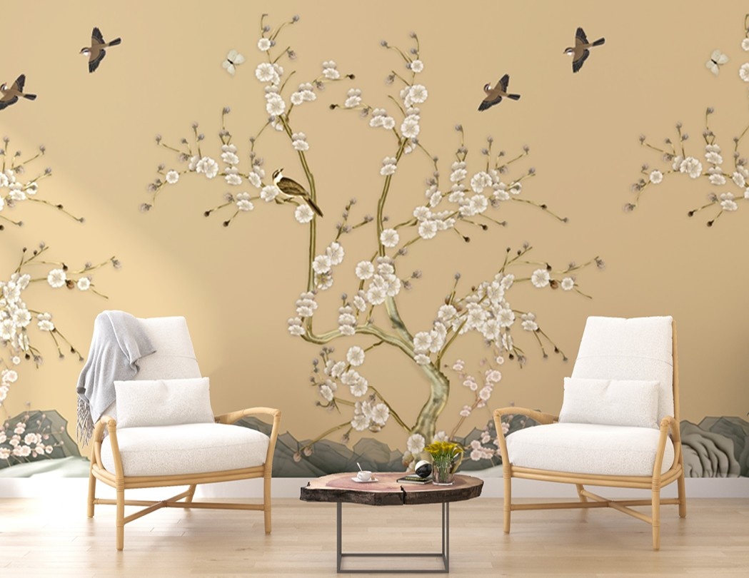 Create a peaceful and elegant retreat with the Golden Blossom Serenity Mural Wallpaper. Featuring delicate white blossoms on graceful branches, softly perched birds, and a warm golden sky backdrop, this design evokes the calm beauty of nature in bloom. Subtle landscape elements at the base add depth and balance, making it ideal for living rooms, bedrooms, meditation spaces, or lounges. This wallpaper brings a sense of harmony, warmth, and timeless sophistication—perfect for interiors that seek tranquility with an artistic touch.