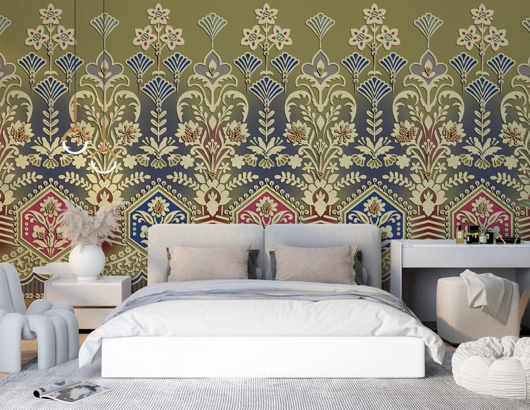 Elevate your interiors with the Royal Art Deco Floral Heritage Wallpaper, a striking fusion of classic elegance and decorative artistry. Featuring symmetrical floral and fan motifs layered with ornate borders in rich olive, gold, sapphire, and ruby tones, this design brings depth and grandeur to any space. Ideal for bedrooms or statement walls, it creates a refined yet dramatic atmosphere inspired by traditional craftsmanship with an Art Deco influence. This wallpaper is perfect for those seeking timeless luxury with a bold, artistic presence.