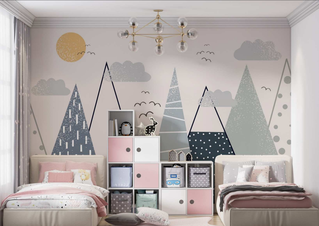 The mural’s muted palette of greys, blush pinks, and soft blues adds warmth and balance to the space, making it ideal for shared rooms, nurseries, and play areas. Its abstract design keeps the room looking modern while still feeling playful and child-friendly. Birds, clouds, and textured shapes add subtle visual interest without distracting from the room’s decor.
